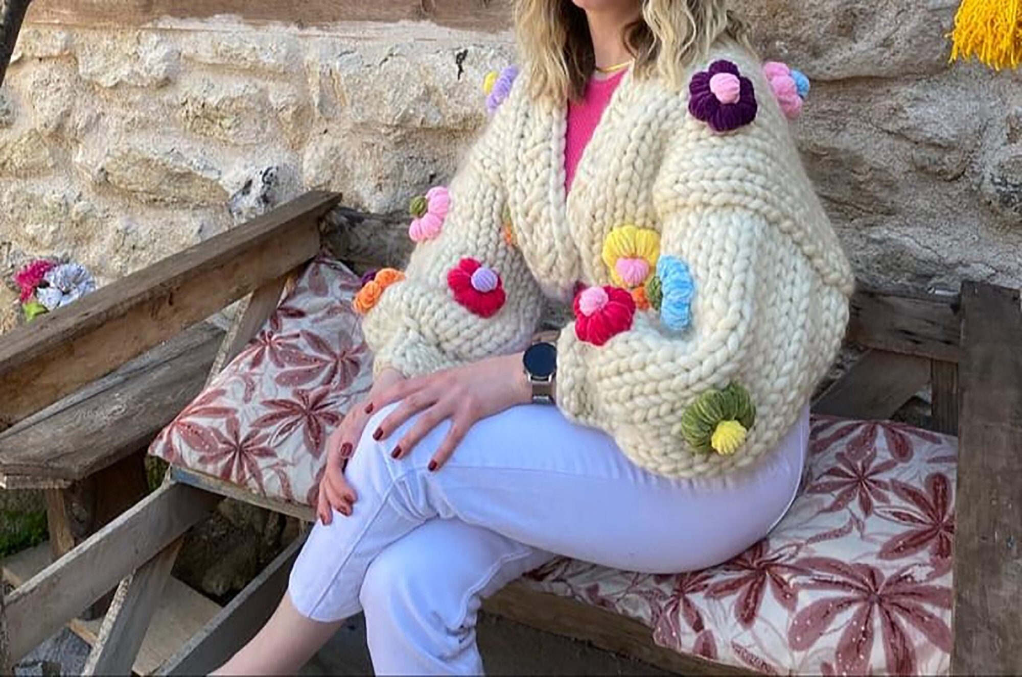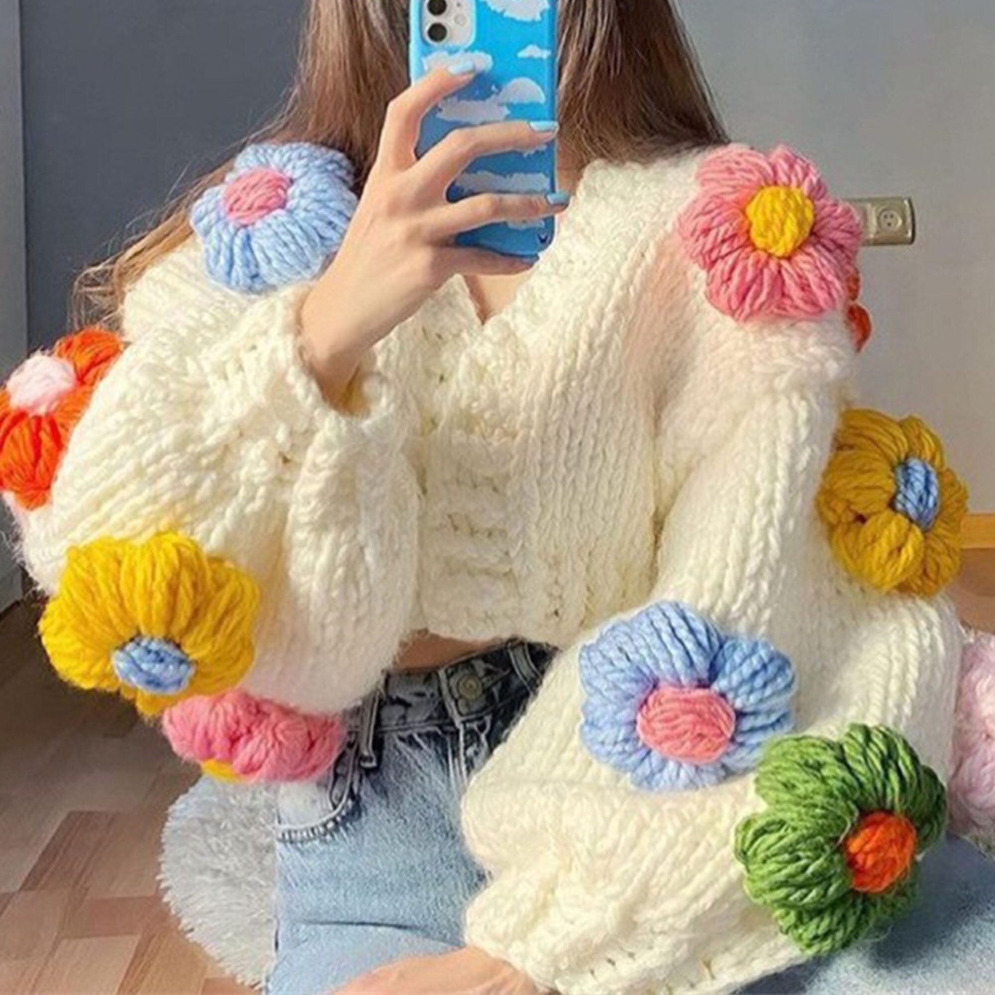 Chunky Knitted Cardigan Flowers Etsy